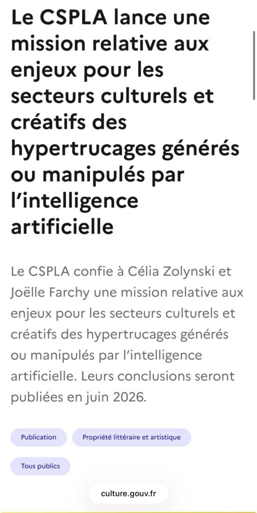 Voici le lien vers l’article du Ministère de la Culture : Le CSPLA lance une mission relative aux enjeux pour les secteurs culturels et créatifs des hypertrucages générés ou manipulés par l’intelligence ar… | Ministère de la Culture