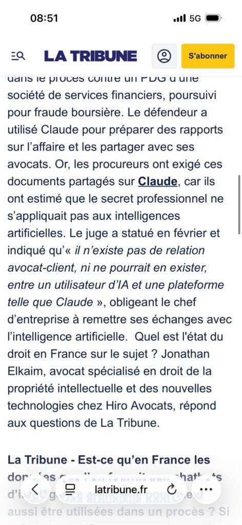 Voici le lien vers l’article du journal La Tribune : Droit : « Demain, on pourra demander au juge d’ordonner à une IA de transmettre vos données ».